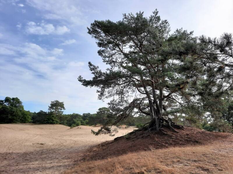 Hier staan ook dennen. Soms verdwijnen de bomen bijna onder het stuivende zand en soms heeft de wind de wortels blootgelegd, wat hier duidelijk het geval is.