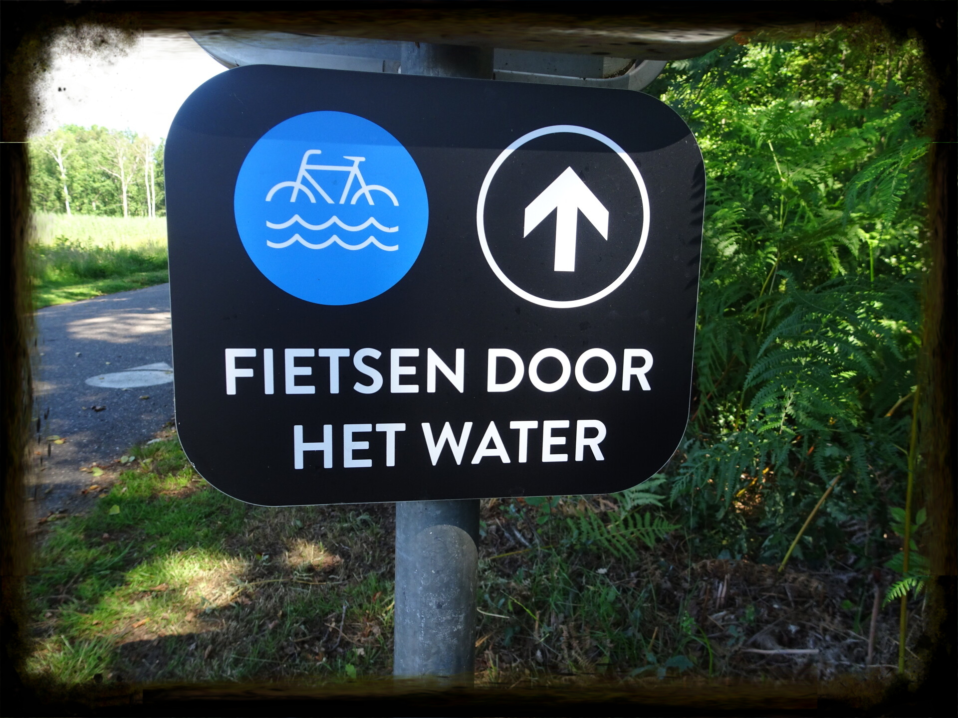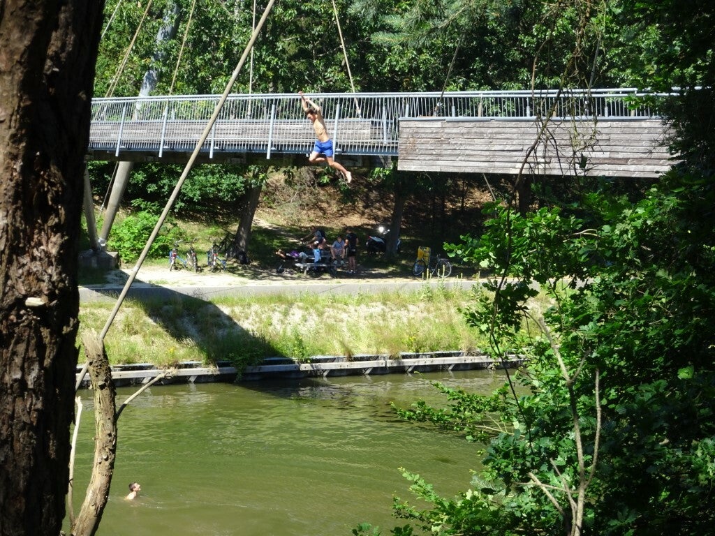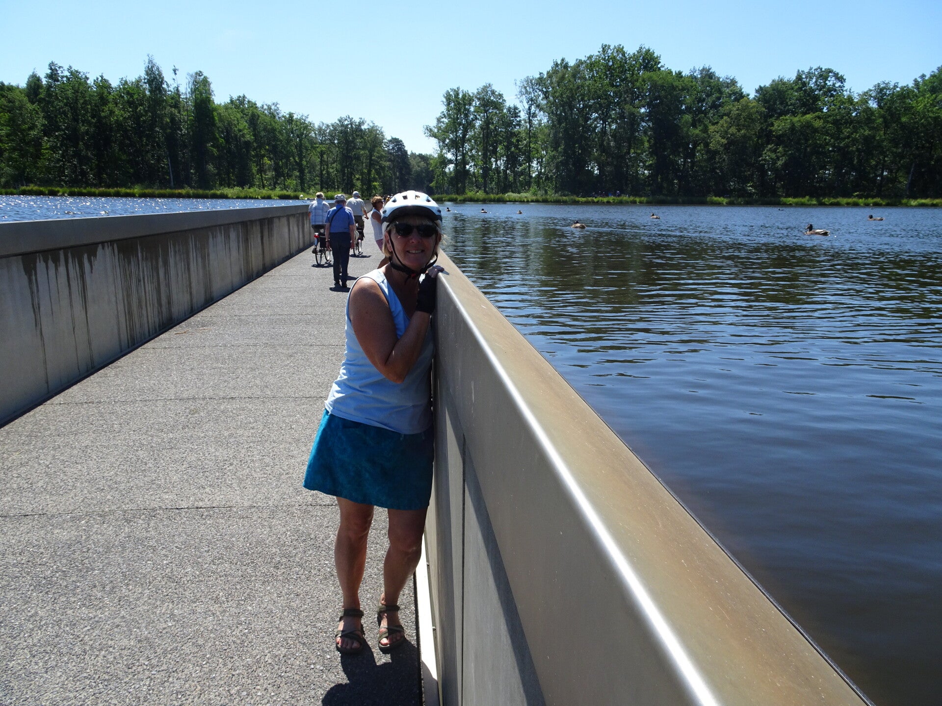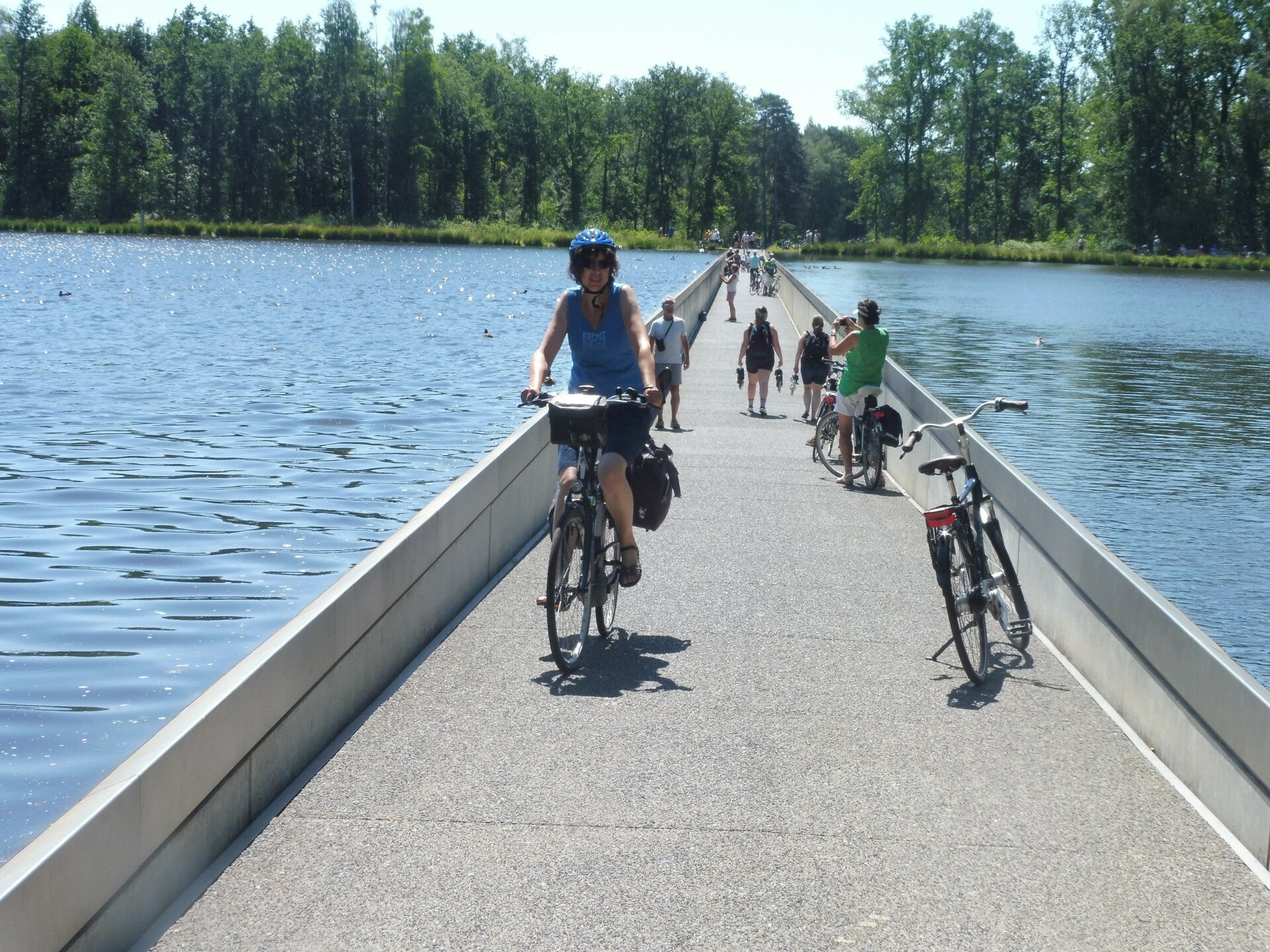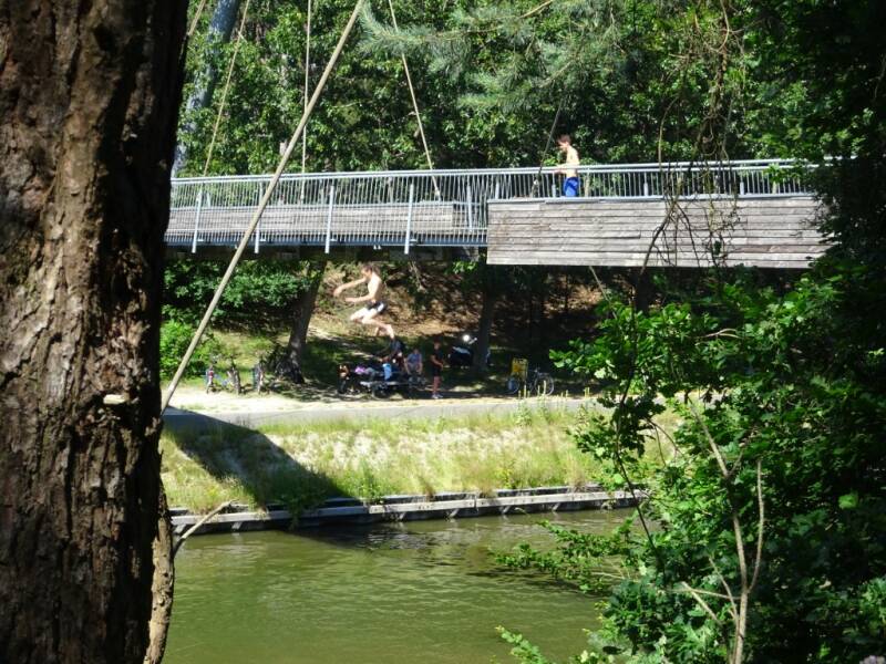 Het fietspad leidt je 200 meter dwars door een vijver, helemaal van de ene oever tot aan de andere. In het midden staat het water aan weerszijden op ooghoogte. Je voelt, ziet en ruikt het water. Een mooi en uniek zicht over dit stukje natuur. Wanneer je vanop een afstand toekijkt is het grappig om al die hoofden op het wateroppervlak voorbij te zien gaan. (Bron: visitLimburg)
