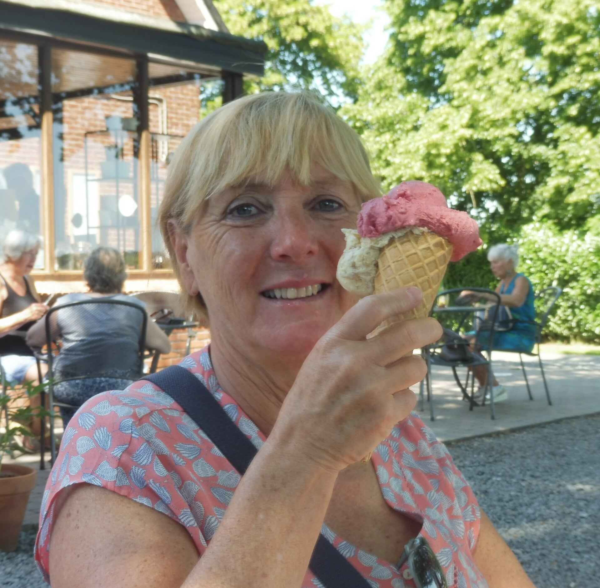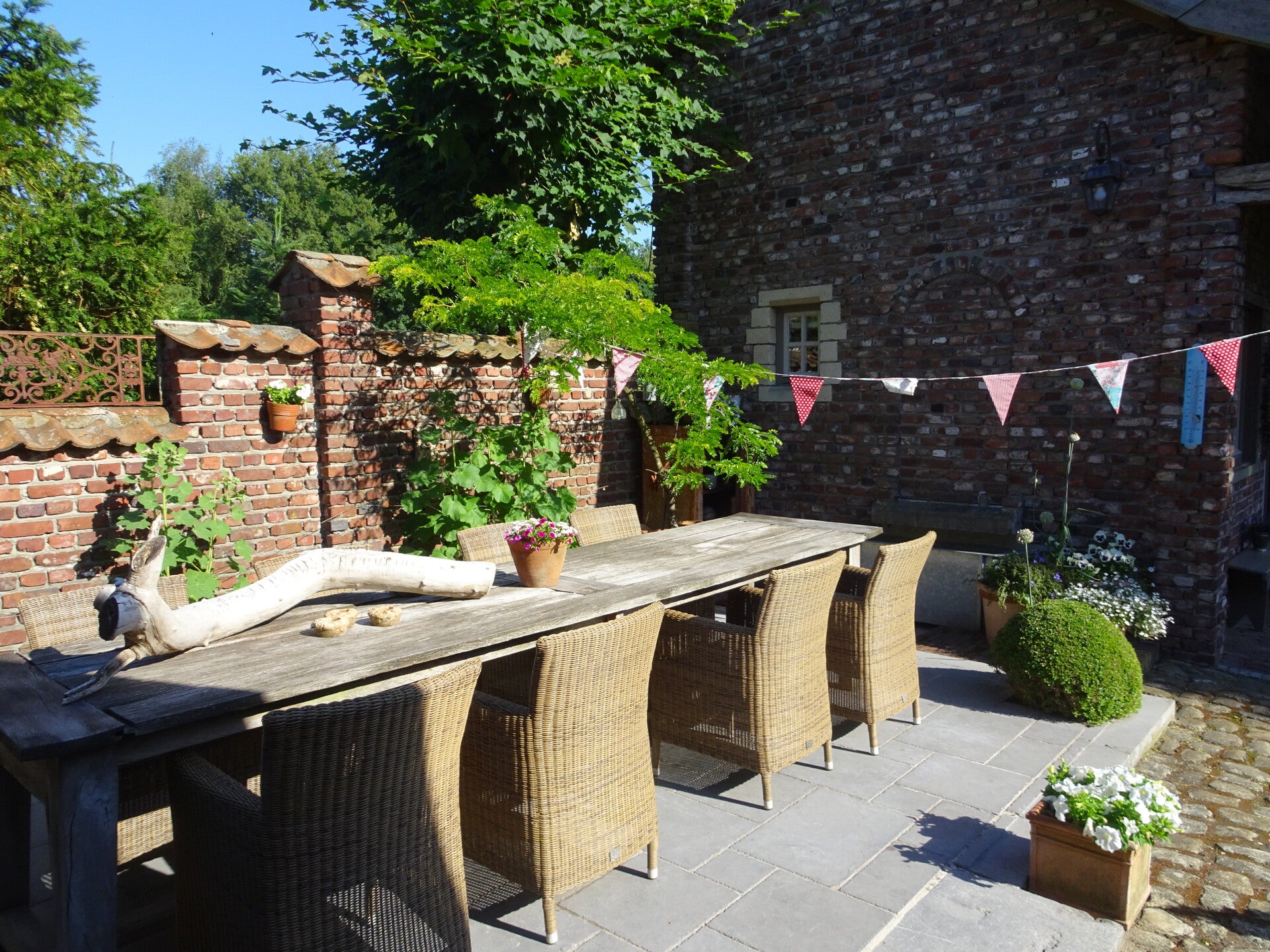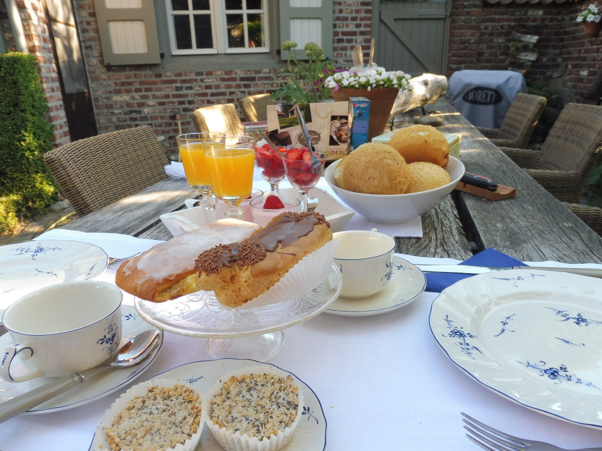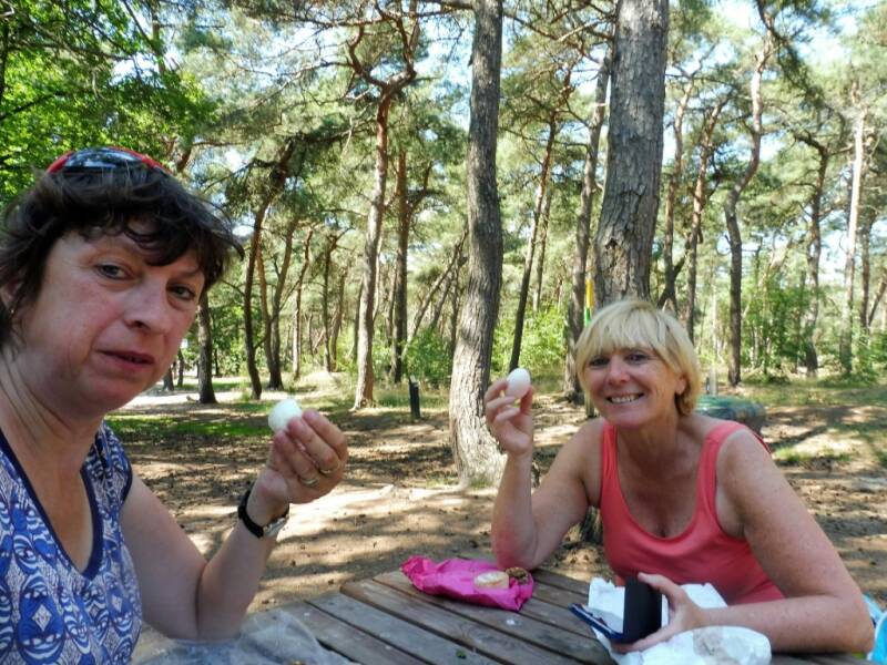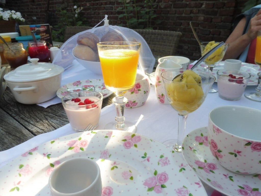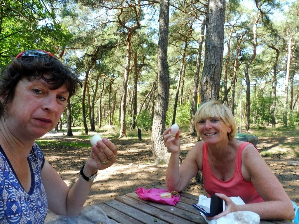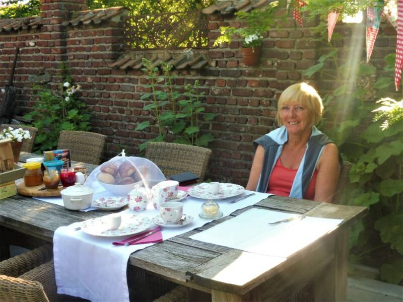 Onder een stralende zon, verwennen we eerst het schattig hondje die ons altijd kwam begroeten, om dan een lekker ontbijtje te nuttigen in Engelse stijl. We fietsen dan via de knooppunten langs mooie bezienswaardigheden.