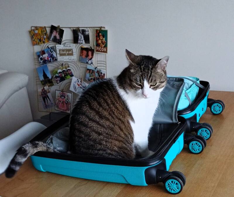 Tijgertje kijkt me met grote ogen aan, alsof hij nog een sprankje hoop koestert dat hij mee mag. Maar helaas, zijn lot ligt in de zorgzame handen van mijn lieve buren.