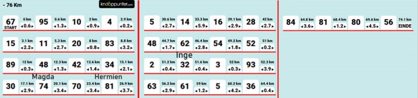 In Kortemark doen we nog een koffiepauze, en Hermien verlaat ons bij KP 43. Magda en ik rijden het laatste stuk samen tot in Ichtegem en bij KP 74 scheiden ook onze wegen. We hadden de hele terugtocht tegenwind, maar hoe dichter bij de zee, hoe harder de wind.