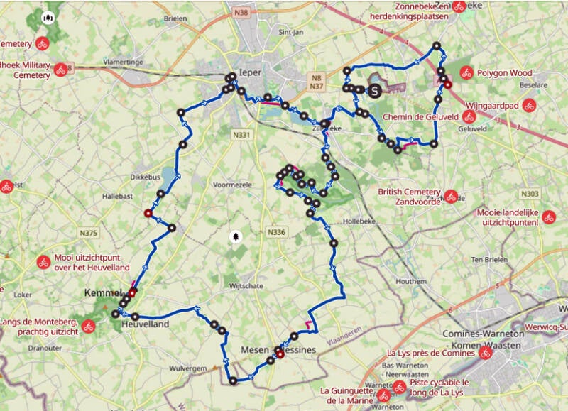 We rijden via het Dikkebusgrindpad zo'n 4 km verder naar Ieper en fietsen dan terug langs de vestingen richting Zillebeke.