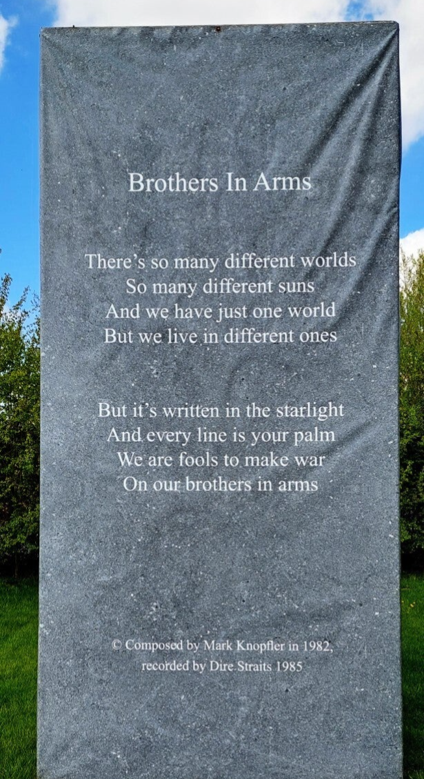 In de eerste steen heeft Mark Knopfler persoonlijk de tekst van Brothers in Arms handmatig gekapt – een krachtig symbool voor generaties en de waanzin van oorlog.