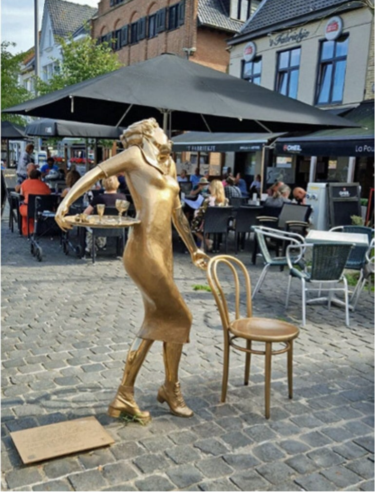 Op een hoek van de markt staat een beeld van Eliane Cossey.