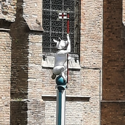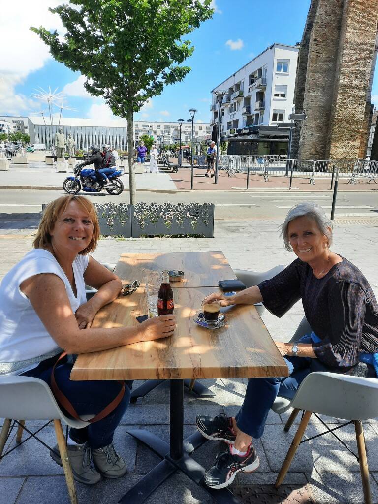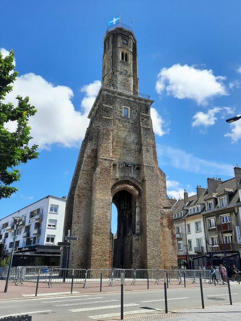 We verlaten de Vissenwijk en gaan naar Place d'Armes, die ooit het belangrijkste levendige gebied van het middeleeuwse Calais was. Helaas werd het grootste deel vernietigd in de oorlog en van het oorspronkelijke plein is alleen de 13e-eeuwse uitkijktoren overgebleven. Bij de renovatie werd Place d'Arme begiftigd met het bronzen standbeeld van Charles de Gaulle en Yvonne Vendroux (geboren in Calais) (Wikipedia). Even pauzeren bij het café de la Tour dat grenst aan de wachttoren.