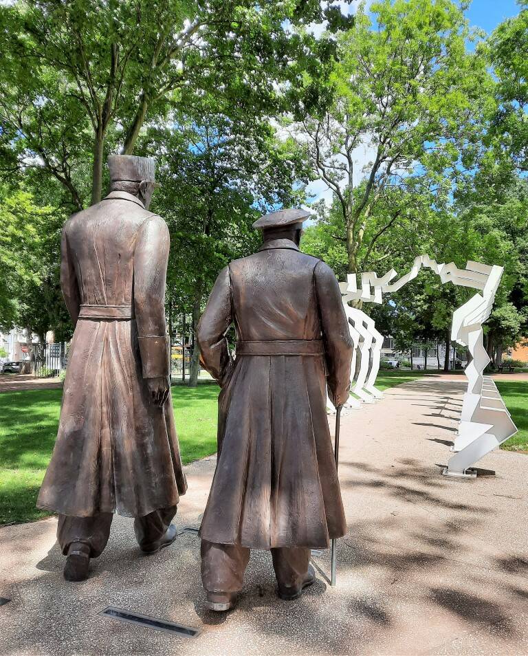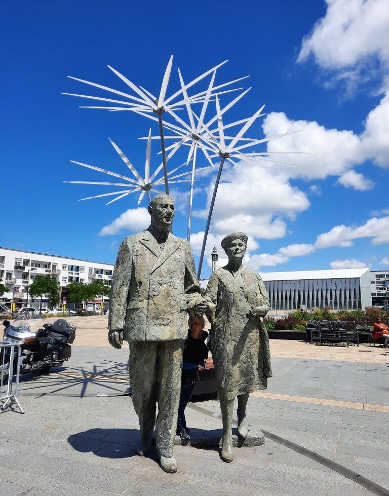 Wat verder komen we aan in het Parc Richelieu, waar 2 bronzen beelden van 3 m hoog staan van Sir Winston Churchill en generaal De Gaulle. 7 bogen in gegalvaniseerd staal gelakt symboliseren Frankrijk in wederopbouw (berthaud-sculpture).