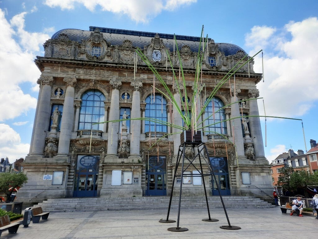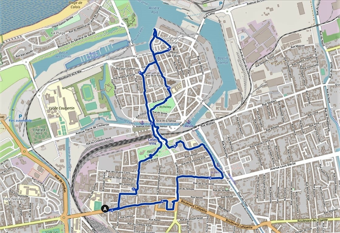 We parkeren de auto op 800 m van ons parcours en volgen Boulevard Léon Gambetta tot aan Place Albert 1er, waar het Grand Théatre de Calais (1903) zich bevindt . Het theater is gebouwd in barokke stijl, naar het voorbeeld van het Palais Garnier. Het monument ervoor is ter ere van Joseph-Maire Charles genaamd Jacquard (1752-1834). Hij ontwierp de weefmachines die ook nu zijn naam nog dragen. Aan het theaterplein steken we de boulevard over en komen in de rue de Jacqaurd om 500m verder rue de Vic in te slaan (hier horen we de weefmachines van een kantfabriek) tot aan het kanaal Calais-Saint-Omer.