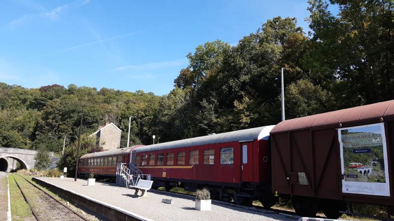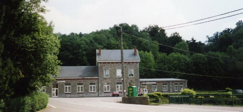 We rijden met de auto 7 km verder en parkeren nabij het station Gendron-Celles. Dit is een spoorwegstation langs spoorlijn 166 (Dinant-Bertrix) in Celles, een deelgemeente van de gemeente Houyet. Het is nu een stopplaats. Het station draagt een dubbele naam: Gendron verwijst naar een nabijgelegen gehucht en Celles naar de voormalige gemeente waar het gelegen was (sedert 1977 een deelgemeente van Houyet). Met amper 20 reizigers per gemiddelde weekdag is Gendron-Celles een van de kleinste stopplaatsen in België. (Bron: Wikipedia). We stappen richting park Furfooz