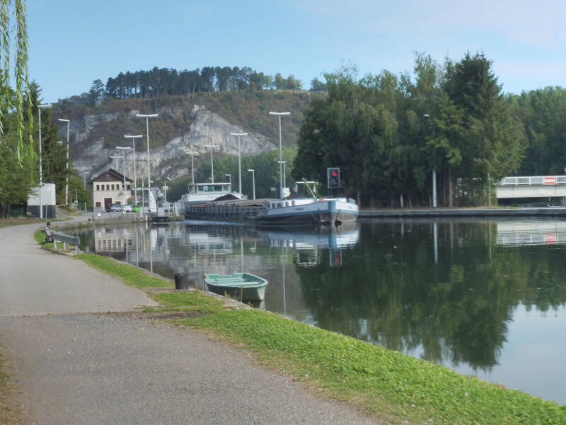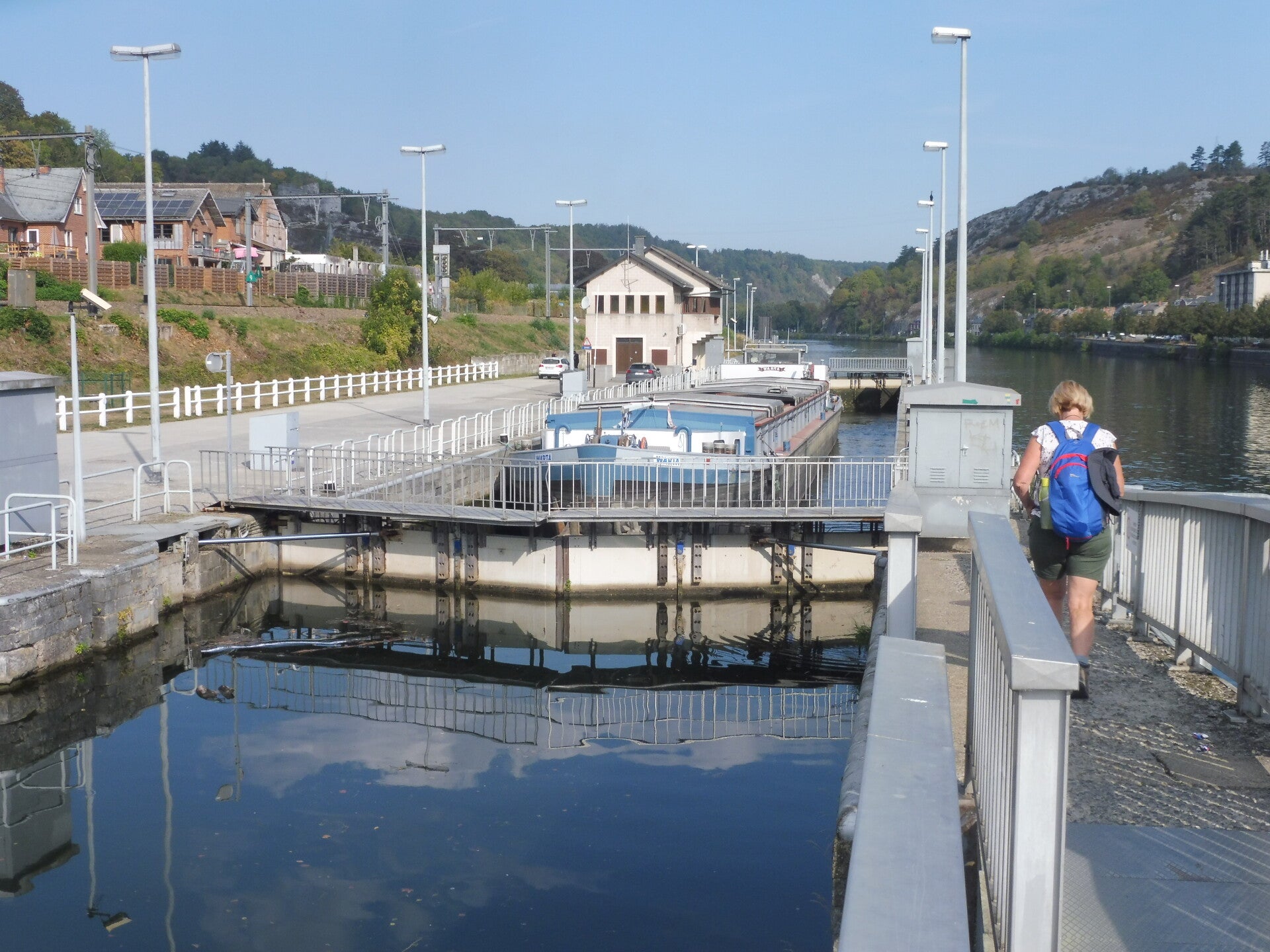 Op onze laatste dag gaan we rechts van het hotel en steken een sluizencomplex over om dan links de Maas te volgen tot in Houx.