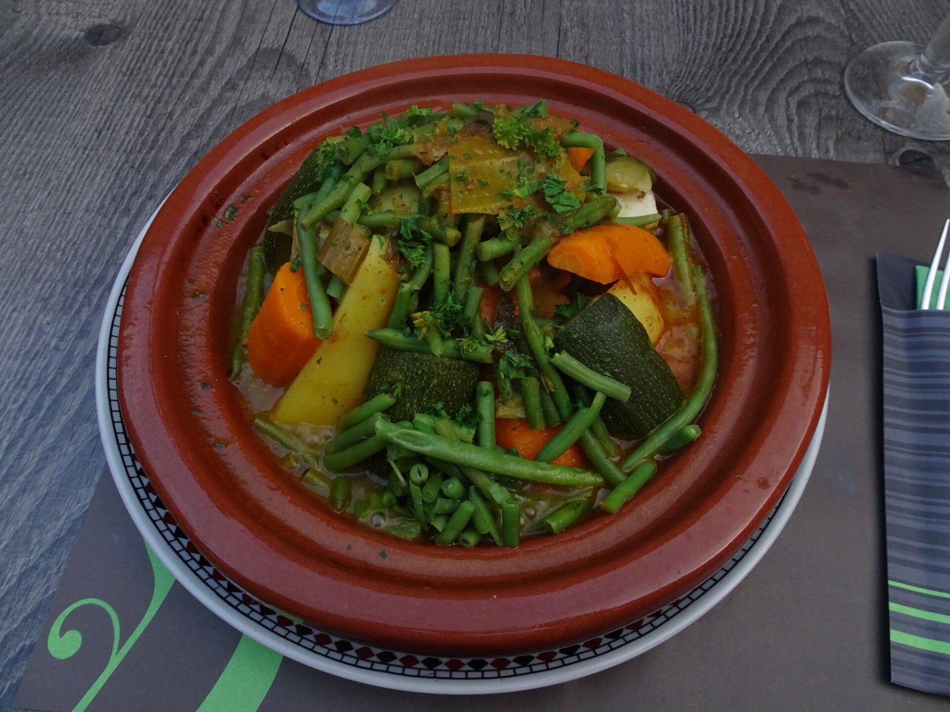 Na een lange zoektocht om een tafeltje te bemachtigen op een zonnige maandagavond zijn we in een Marokkaans restaurant terechtgekomen, gelegen in een rustige buurt en weg van de overbevolkte promenade aan de Maas. Zeer aangenaam ontvangen, we kregen een plaatsje in de kleurrijke tuin en hebben gesmuld van een rijkelijke smaakvolle tajine. We waren blij dat onze andere pogingen mislukt waren.