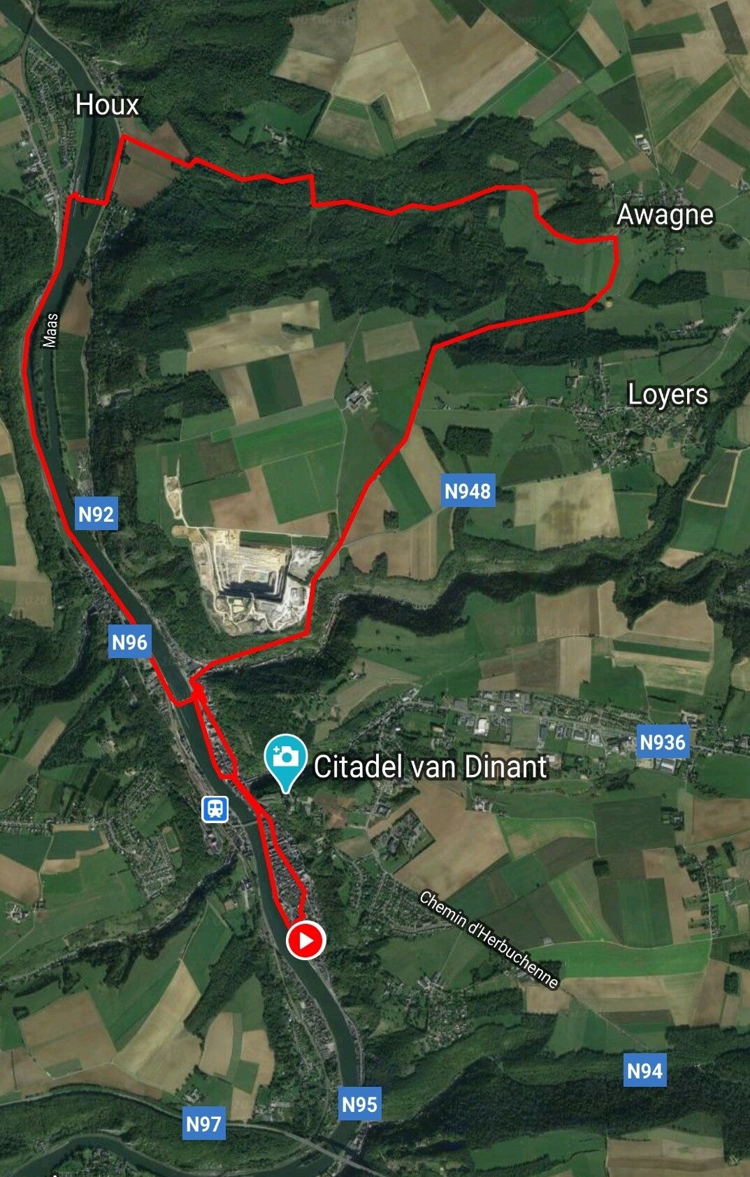 We hebben wel de GR in Houx gemist en zijn net voor het dorp de bossen ingegaan naar ons verste punt Awagne. Onze terugweg gaat meestal door de velden, waar we via de abdij van Leffe en de binnenstad van Dinant de auto bereiken om huiswaarts te keren.