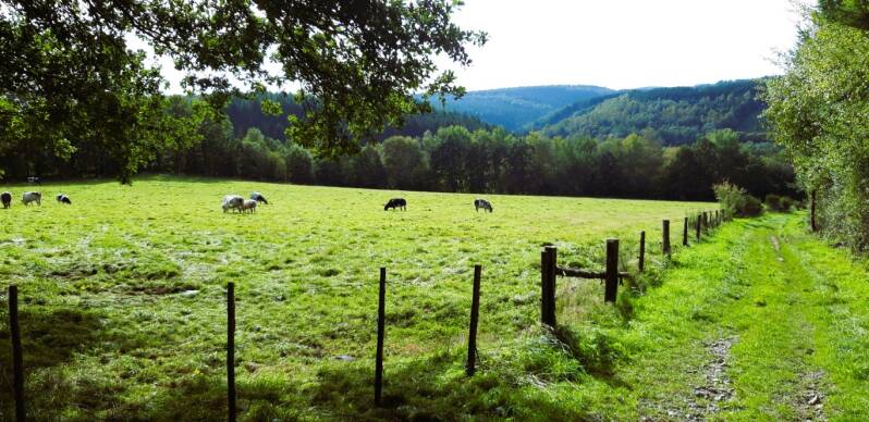 We gaan onder de snelweg door richting Longue Virée, waar weiden en bossen elkaar opvolgen vooraleer we op de weg naar Achouffe komen.