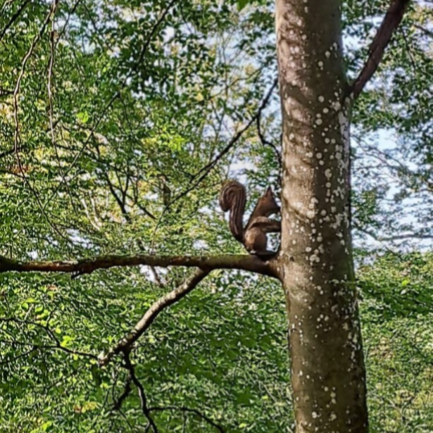 We stappen nu verder door een loofbos en komen uit op een open plek waar gebeeldhouwde houten dieren niet bang zijn voor onze aanwezigheid.