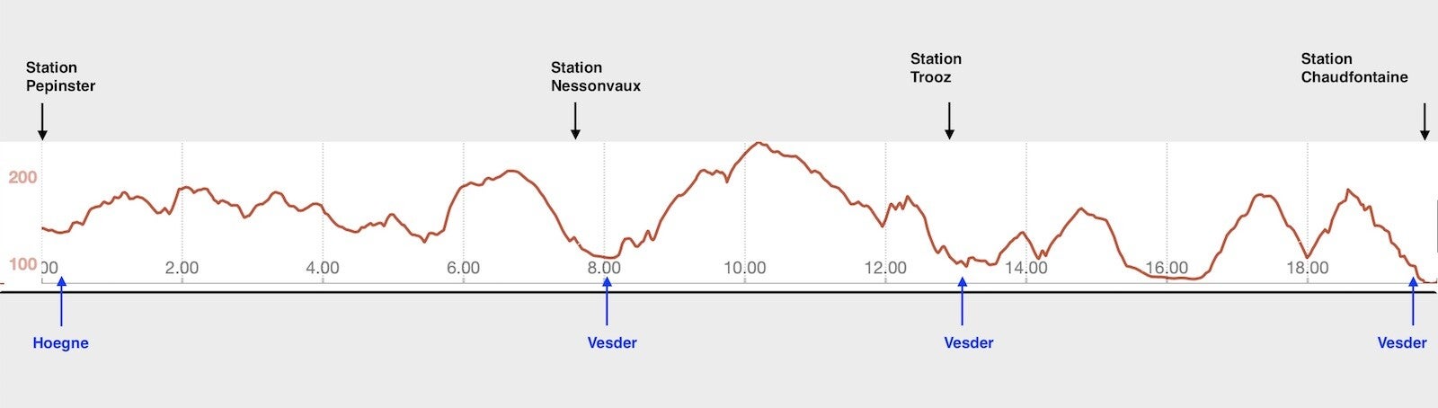 We stappen de GR573 van station Pepinster naar station Chaudfontaine, langs de oevers van de Vesder. We passeren langs de treinhaltes van Nessonvaux en Trooz.