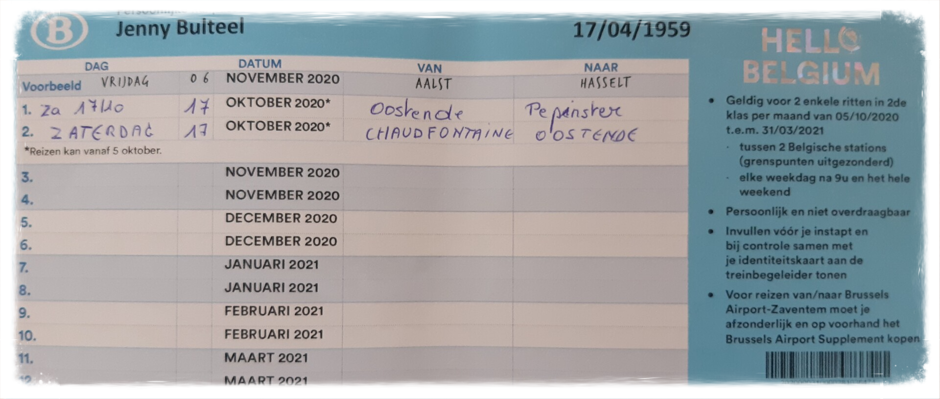 In de maand juni kondigde de federale regering een gratis treinkaart aan. Deze kaart heeft de naam Hello Belgium Railpass gekregen en ze biedt twee gratis enkele ritten per maand gedurende zes maanden vanaf 5 oktober 2020 tot 31 maart 2021.