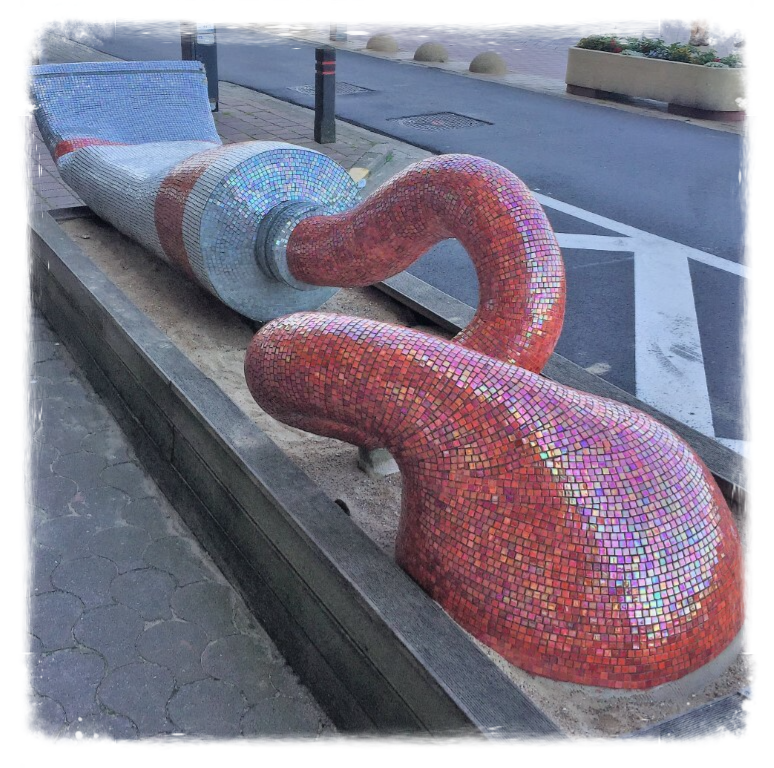 Op het Rubensplein staan twee cilindervormige gebouwtjes die fungeren als zuilen waarop de vijf meter hoge hoofden van West op staan. Wat verderop nog enkele kunstwerkjes (let vooral op het geel exemplaar 😁!)