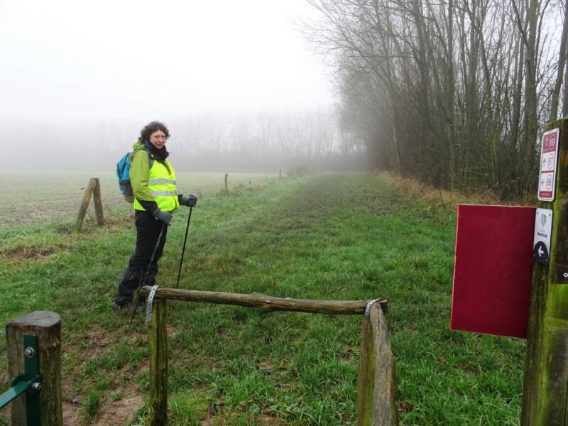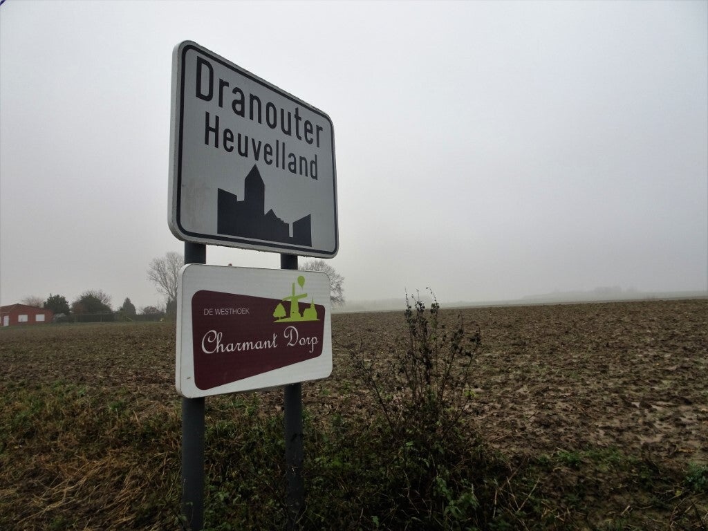We vertrekken in de mist aan de Sint-Jan-De-Doperkerk, gelegen aan het Planciusplein 31/35 in Dranouter.