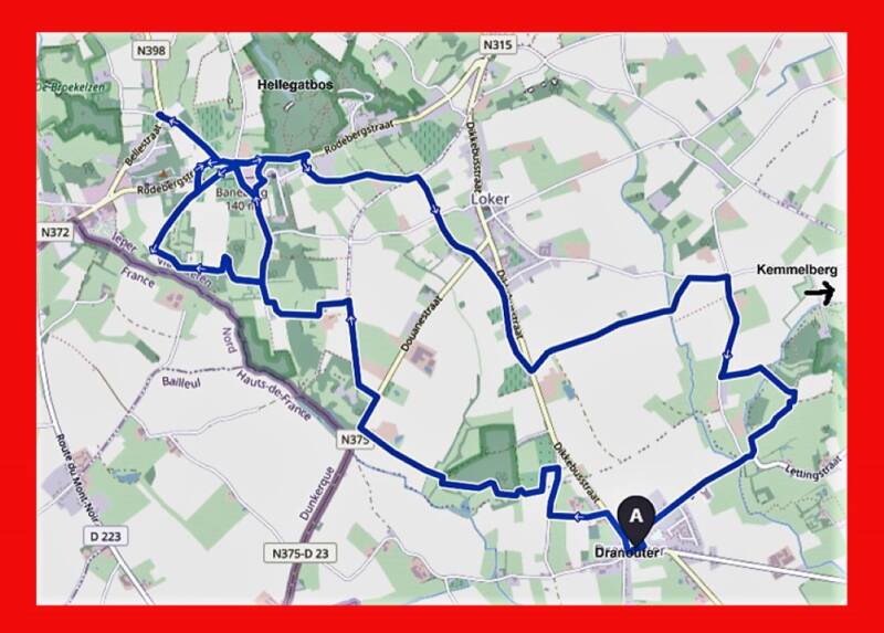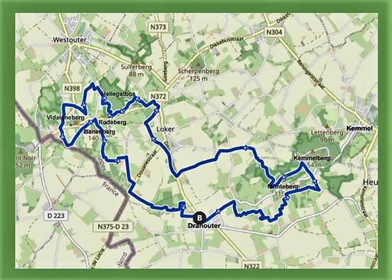 Normaal gezien gingen we vandaag de 1e etappe van de 100km van de Schelde stappen (Gent-Dampoort - Wetteren). Doch verscheen de avond voordien een dringende oproep op FB dat deze wegens onverwachte omstandigheden wordt uitgesteld naar een latere datum. Jammer, maar niet getreurd. Dominique en ik besloten de wandelschoenen aan te trekken en richting Dranouter te gaan. Ik had nog een coronawandeling opgeslagen die ons langs en over de Baneberg, Rodeberg, Vidaigneberg, Hellegatbos, de Monteberg en een stuk Kemmelberg ging voeren. Getten en wandelstokken in de aanslag, want dit belooft een pittige wandeling te worden.