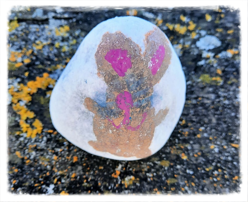 We vertrekken langs de Kaai en vinden daar een beschilderde kei. De idee achter deze zelf geschilderde keien is om een foto te nemen als je er één vindt en die op een FB-pagina te posten. Daarna ‘verstop’ je (om ze relatief gemakkelijk gevonden worden) de steen opnieuw op een plek, klaar om door iemand anders gevonden te worden. Zo gaat elke steen zijn eigen verhaal leiden."