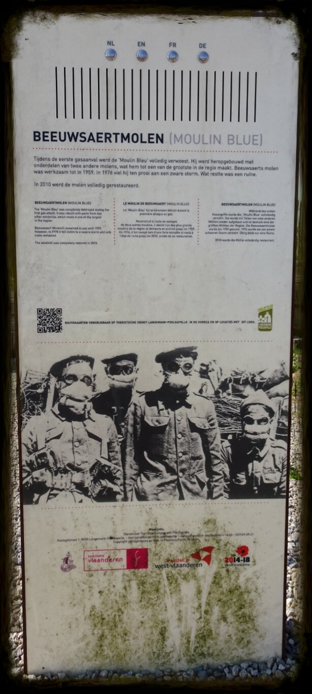 KM 8. De Beeuwsaertmolen dateert uit 1635. In 1830 ging de molen ten gevolge van een blikseminslag in vlammen op. Hij werd onmiddellijk heropgebouwd en daarna verkocht aan de familie Beeuwsaert, vandaar z'n naam. Het bouwwerk telde in die tijd drie verdiepingen, een 'driezolder" noemen kenners dit. Tijdens de eerste gasaanval in 1915 werd de 'Moulin Bleu' volledig verwoest. Hij werd heropgebouwd met de delen van twee andere molens die hem meteen een van de grootste in de regio maakte. Beeuwsaerts molens was werkzaam tot in 1959 (Routeyou).
