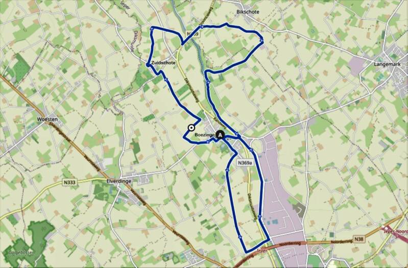 Hier lopen we langs een stil wegeltje parallel met het kanaal Ieper-Ijzer om zo na 13 km terug aan 😻spel (pleintje) te komen.