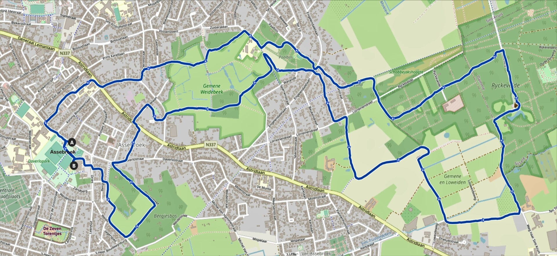 A: 7,58 km (Gemene- en Loweiden, Ver-Assebroek, Steenbrugse Bosjes, Kinderboerderij De Zeven Torentjes)