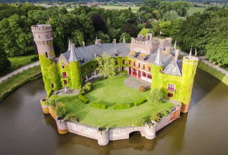 Het neogotische Kasteel van Aartrijke, gebouwd van 1868 tot 1871, gelegen in een romantische tuin met een grote vijver, weiden en bossen.