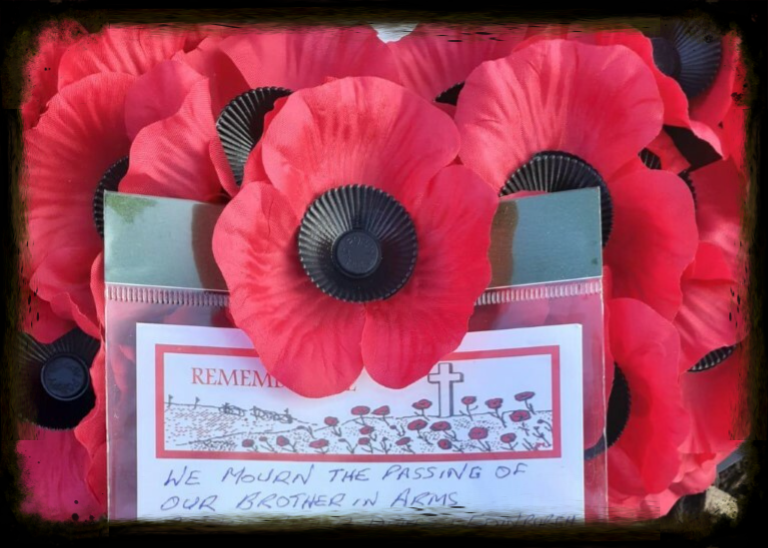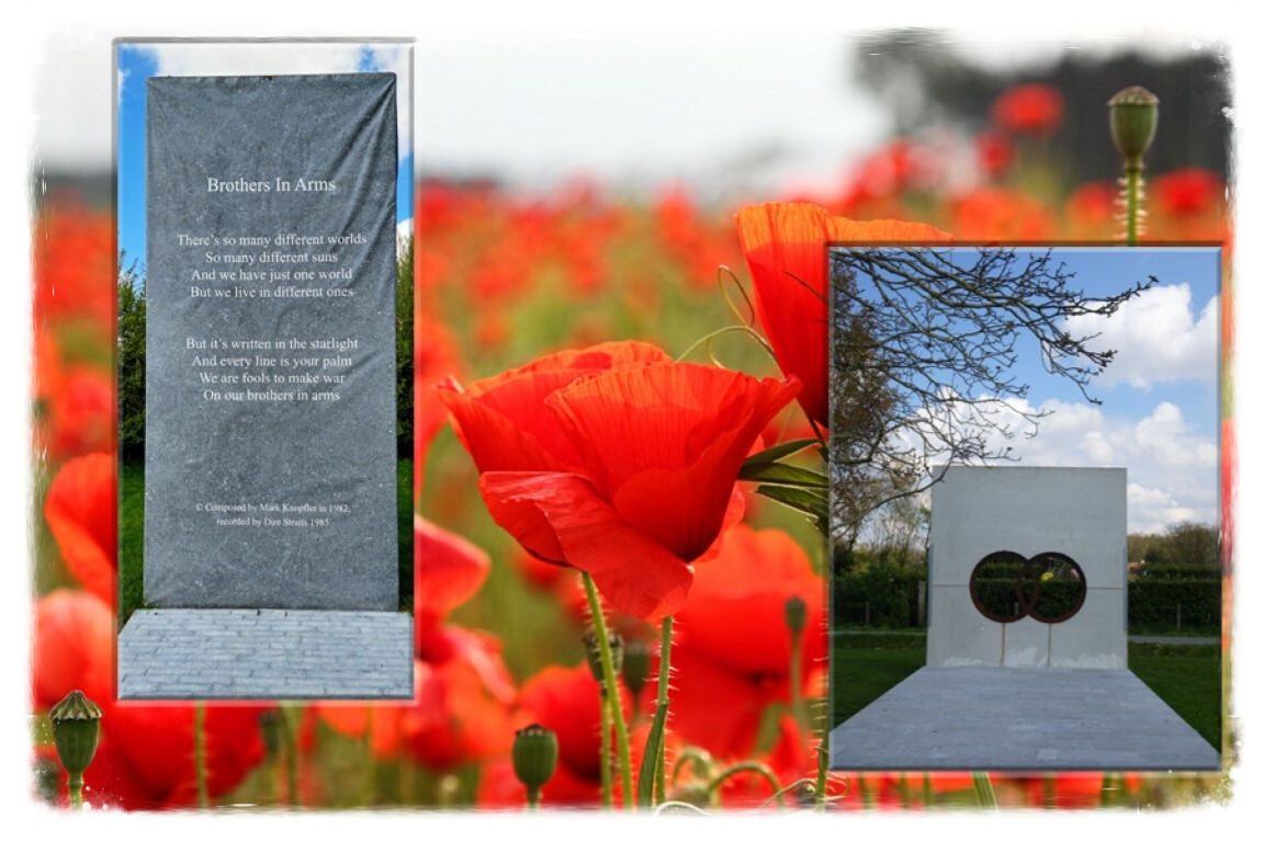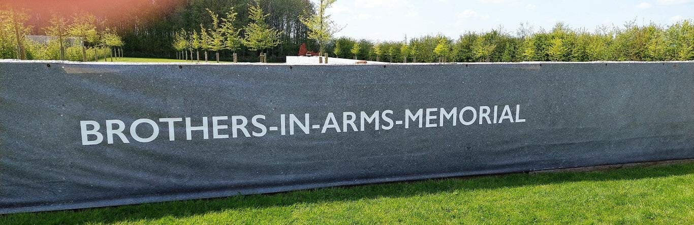 Vooraleer we afzakken naar de parking, bezichtigen we nog het laatste monument 'Brothers-In-Arms-Memorial'. Dit memoriaal is ter nagedachtenis van alle broers, van welke nationaliteit ook, die sneuvelden tijdens de Eerste Wereldoorlog. Het idee heeft gestalte en vorm gekregen nadat de cafébaas van café 'De Dreve' in 2006 bij de opgraving was van 5 Australische gesneuvelden. Een van die soldaten was John Hunter, die in 1917 getroffen werd door een granaat en in de armen van zijn jongere broer Jim stierf. Jim begroef zijn broer onder een dekzeil en kwam na de oorlog terug om zijn graf te zoeken. Tevergeefs echter, maar bij de opgravingen in 2006 werd het lichaam van het oorlogsslachtoffer alsnog onder het dekzeil gevonden. Dit onroerend verhaal heeft de cafébaas en nog 4 vrijwilligers de aanzet gegeven om het monument te bouwen die over het café ligt.