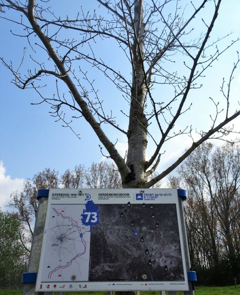 De herdenkingsboom staat bij een oorlogsgedenkteken dat herinnert aan de oprichting in 1914, de gevechten en de slachtoffers van het Canadese infanterieregiment "Princess Patricia's Canadian Light Infantry" in de Ieperboog.