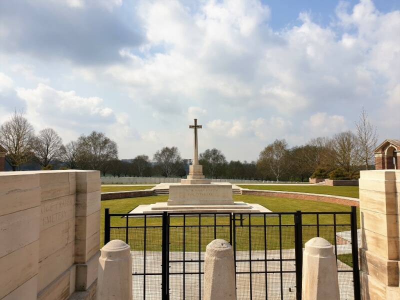 We gaan verder richting Bellewaarde Ridge. Een heuvelrug die tijdens de Groote Oorlog heel belangrijk was en waar hevig gevochten werd. R.E. Grave, Railway Wood is een Britse militaire begraafplaats met gesneuvelden uit de Eerste wereldoorlog. Het Cross of Sacrifice geeft de plaats aan waar 1 officier en 11 manschappen van de 177th Tunnelling Company (Royal Engineers) omkwamen tijdens de ondergrondse oorlogvoering tussen november 1915 en augustus 1917. Daarom staan er geen grafzerken, maar zijn hun namen en regimenten op de basis van het Cross of Sacrifice gebeiteld.