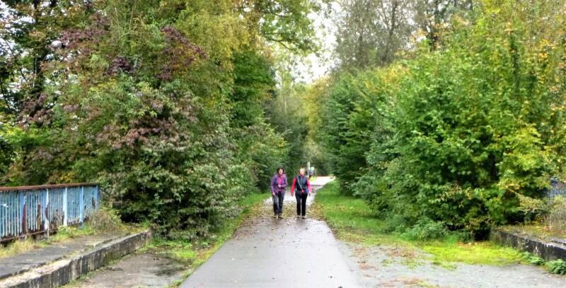 De kerk van Saint Géry in Ronquières dateert uit de zestiende eeuw en staat op een rotspunt. We gaan via een smal paadje (Sentier d'Ecaussines) naar de Ravel 106 en volgen het riviertje de Sennette. Af en toe voelt Bart zich geroepen om de collega's hun kennis te testen over oude spoorwegpalen.