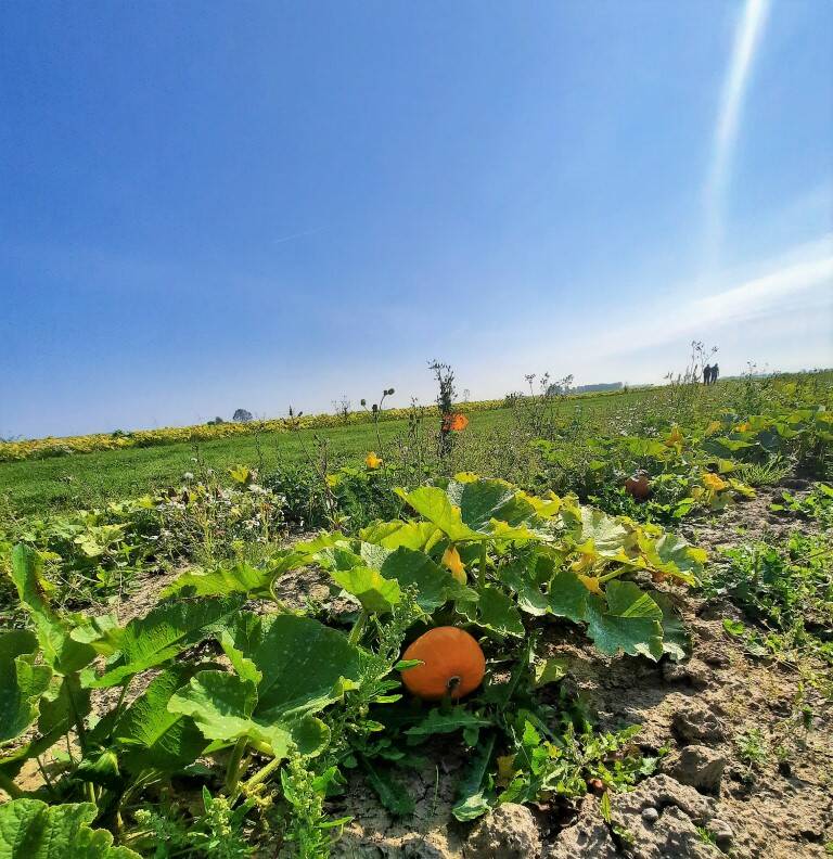 Aan de Sasputsestraat kom ik na 13 km aan de 2e rustpost en ga dan langsom het erf door een pompoenveld en weiland.