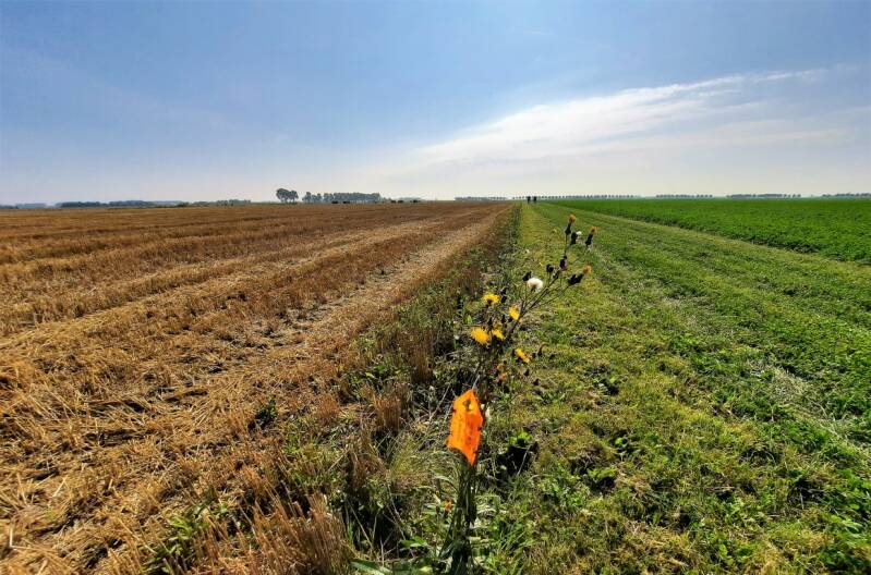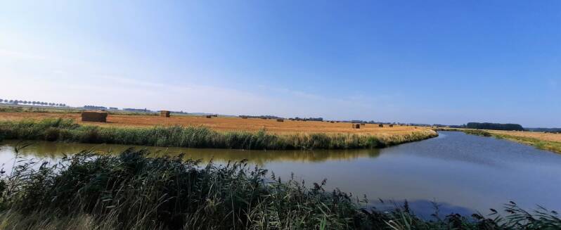 Schoon en droog gewonnen tarwe strobalen, prijken mooi tegenaan de Goternisse kreek. 1 km verder loop ik terug langs de Molenkreek, maar nu aan de andere kant.