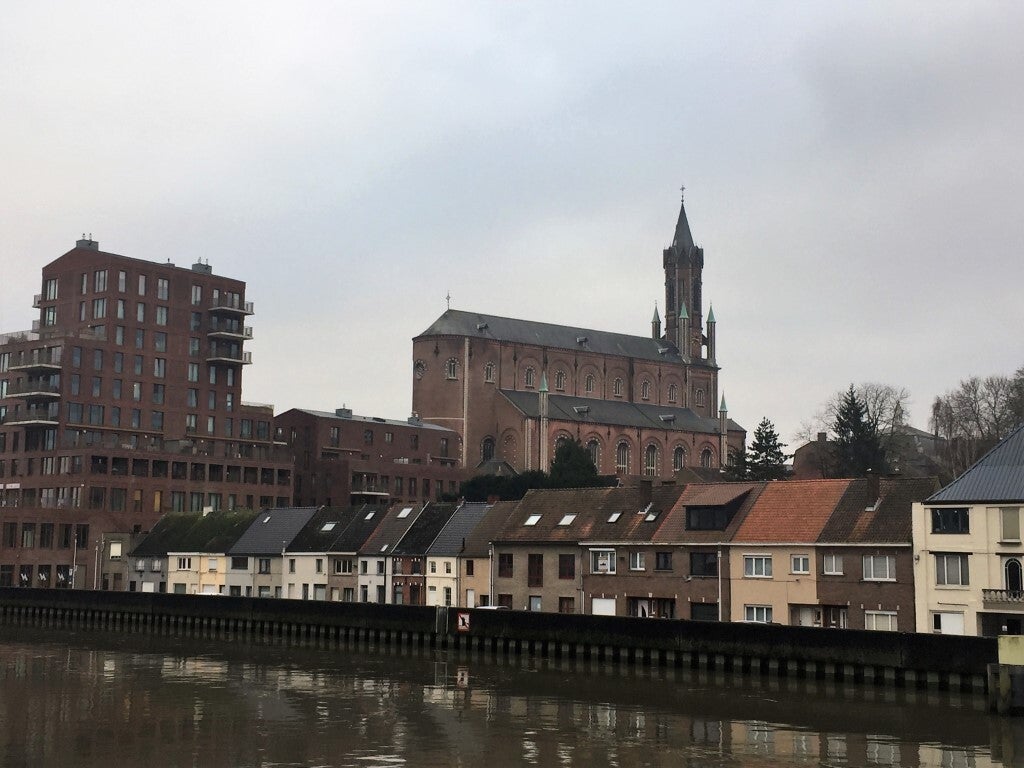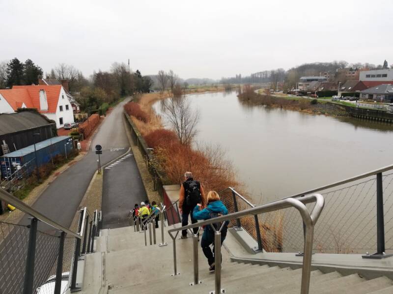 We vervolgen onze weg langs de Koningin Astridlaan tot we 800 m verder de Wetterenbrug over de Schelde kruisen en volgen de GR 128 (de Vlaanderenroute). Hier weer een zicht op de de Sint-Gertrudiskerk, maar eens van de andere kant gezien.