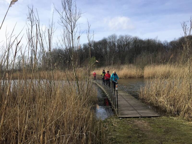Nadat we wat veel door woonwijken en op verharde paden hebben gelopen, bereiken we na 13,5 km het natuurpark Kortbroek van Kruibeke.