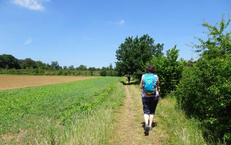 De weg ernaartoe is allesbehalve veilig. We lopen op een fietspad langs een drukke baan. Na 1,3 km zien we een GR-pad en deze brengt ons tot bij de grote eik.