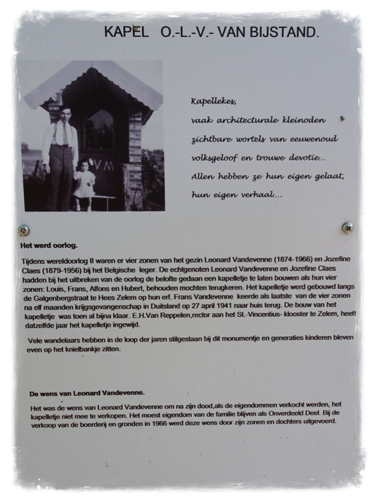 In de bosrijke omgeving van het gehucht Hees, langs een stille wandelweg (Galgenbergstraat) staat een gemetst en goed onderhouden privaat kapelletje. Het werd door de echtgenoten Vandevenne-Claes Leonard en Josephine gebouwd in 1941. Bij het uitbreken van WOII hadden zij een belofte gedaan om een kapel te bouwen als hun vier zonen, die soldaat waren, behouden naar huis terugkeerden. Na de terugkeer van de laatste zoon op 27 april 1941 uit krijgsgevangenschap was het kapelletje bijna klaar.