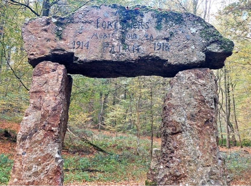 Een steencirkel met elf dolmen rond een portiek waarop de woorden: "Aan de boswachters die stierven voor het vaderland 1914-1918" zijn gegraveerd.