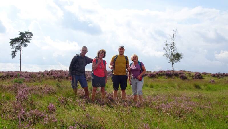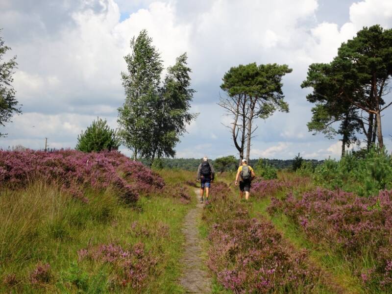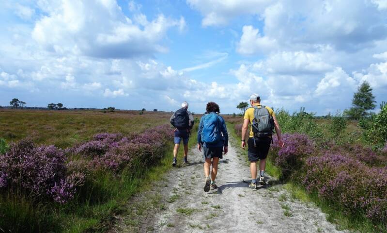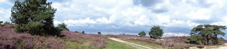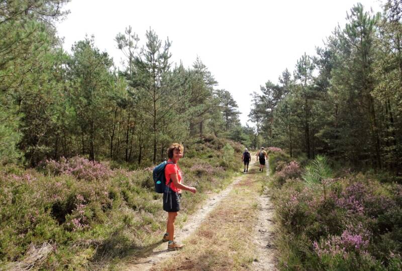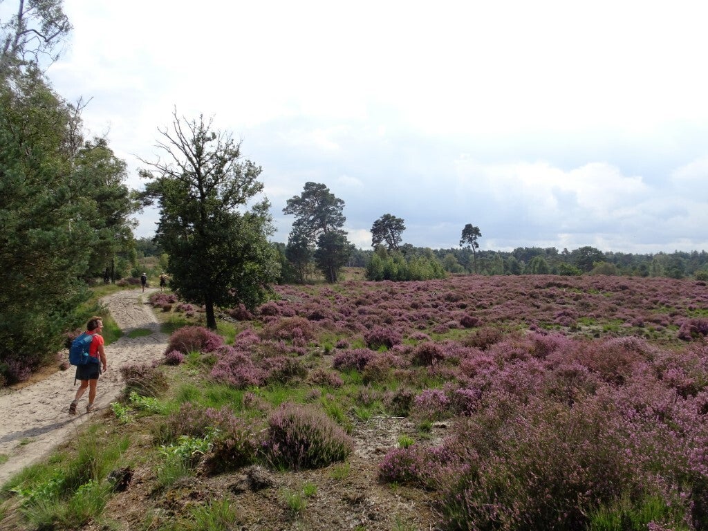 We doorkruisen 6 km de landduinen en ook in het militair oefenterrein van de Ossendrechtse Heide is er paarse pracht.