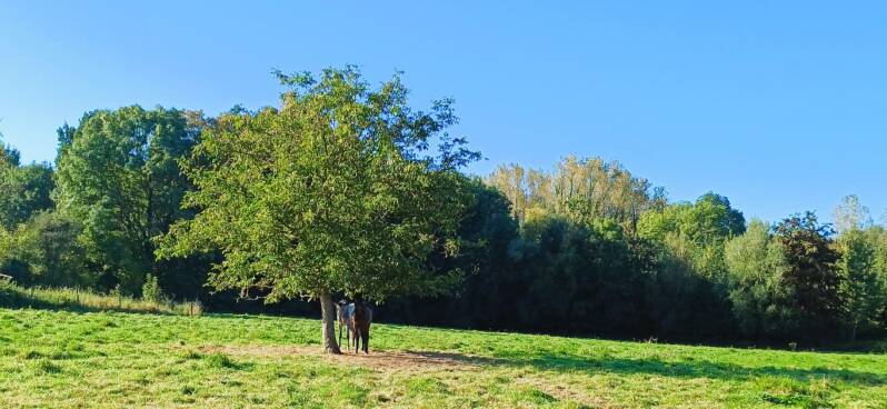 De paardjes zoeken de schaduw van de enige boom in het veld op.