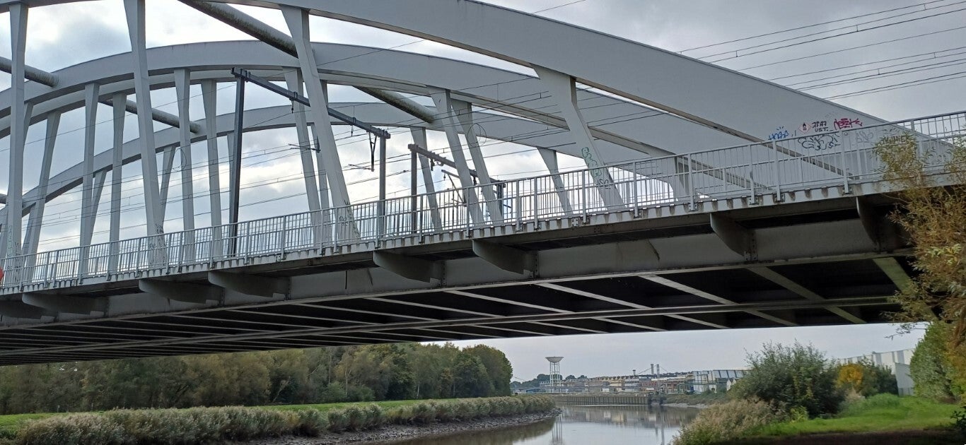 Onder de spoorwegbrug en fietsostrade zien we in de verte Duffel liggen.