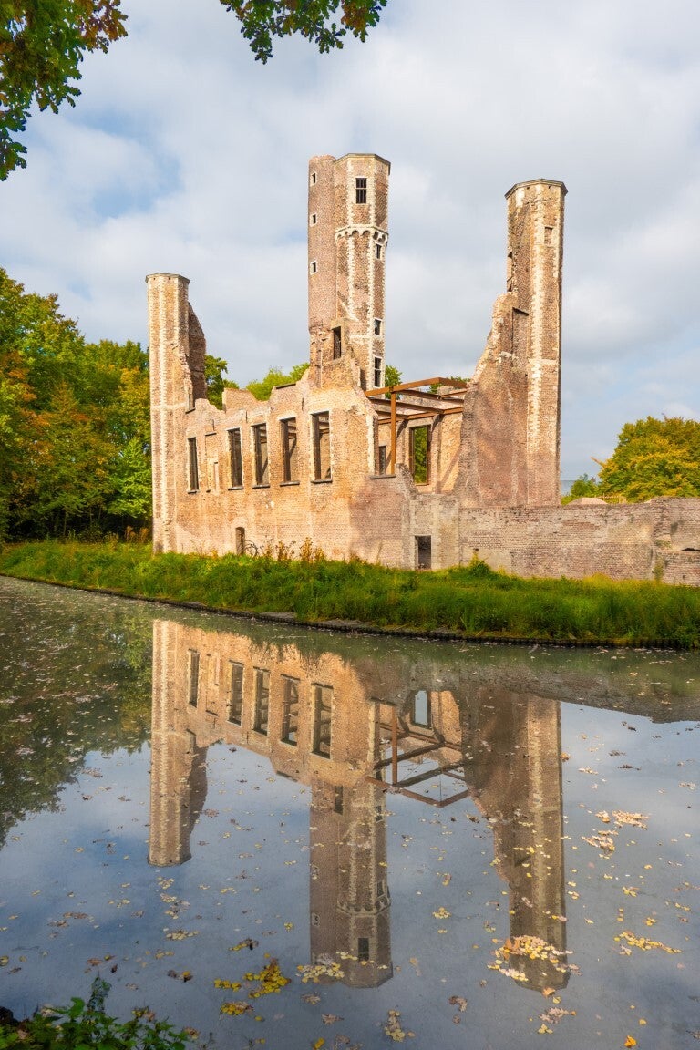 Langs de Beneden-Nete lopen we een pad in en komen bij de kasteelruïne Ter Elst in het gelijknamige park.